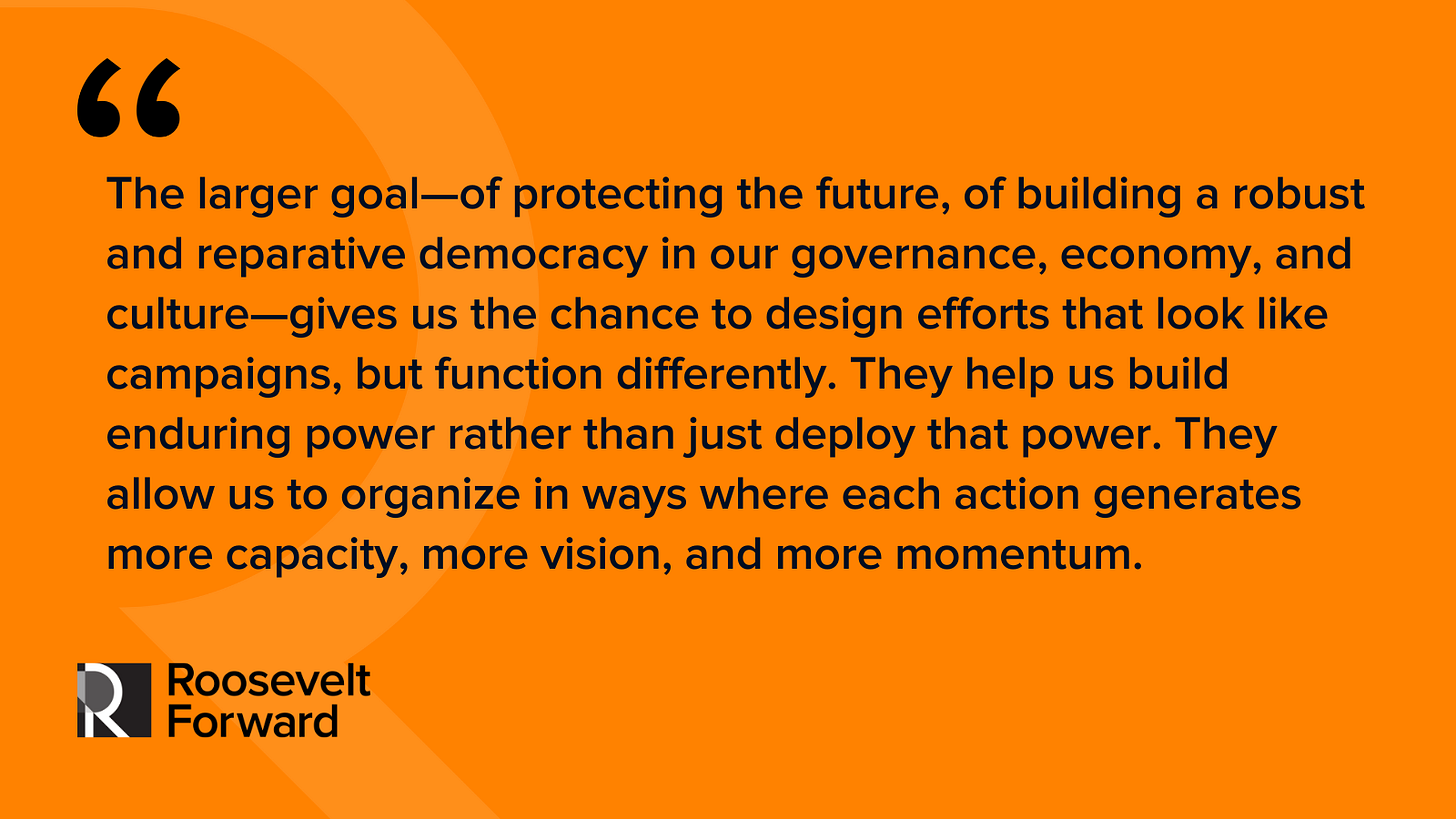 I think we’re in a moment where there’s openness to that kind of approach. And honestly, it’s what movements often do best when we’re not bound to a specific campaign. The larger goal—of protecting the future, of building a robust and reparative democracy in our governance, economy, and culture—gives us the chance to design efforts that look like campaigns, but function differently. They help us build enduring power rather than just deploy that power. They allow us to organize in ways where each action generates more capacity, more vision, and more momentum.